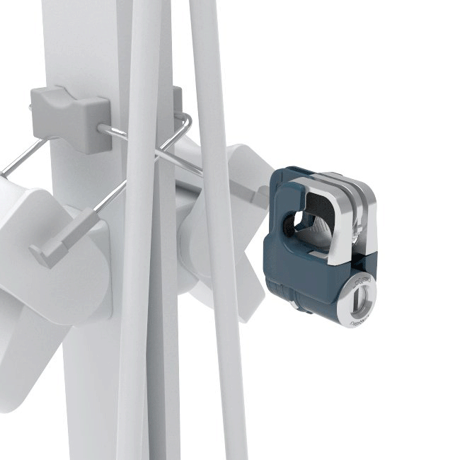 - Place ski poles into the left and right sliders; close the sliders shut and lock with the high security key.